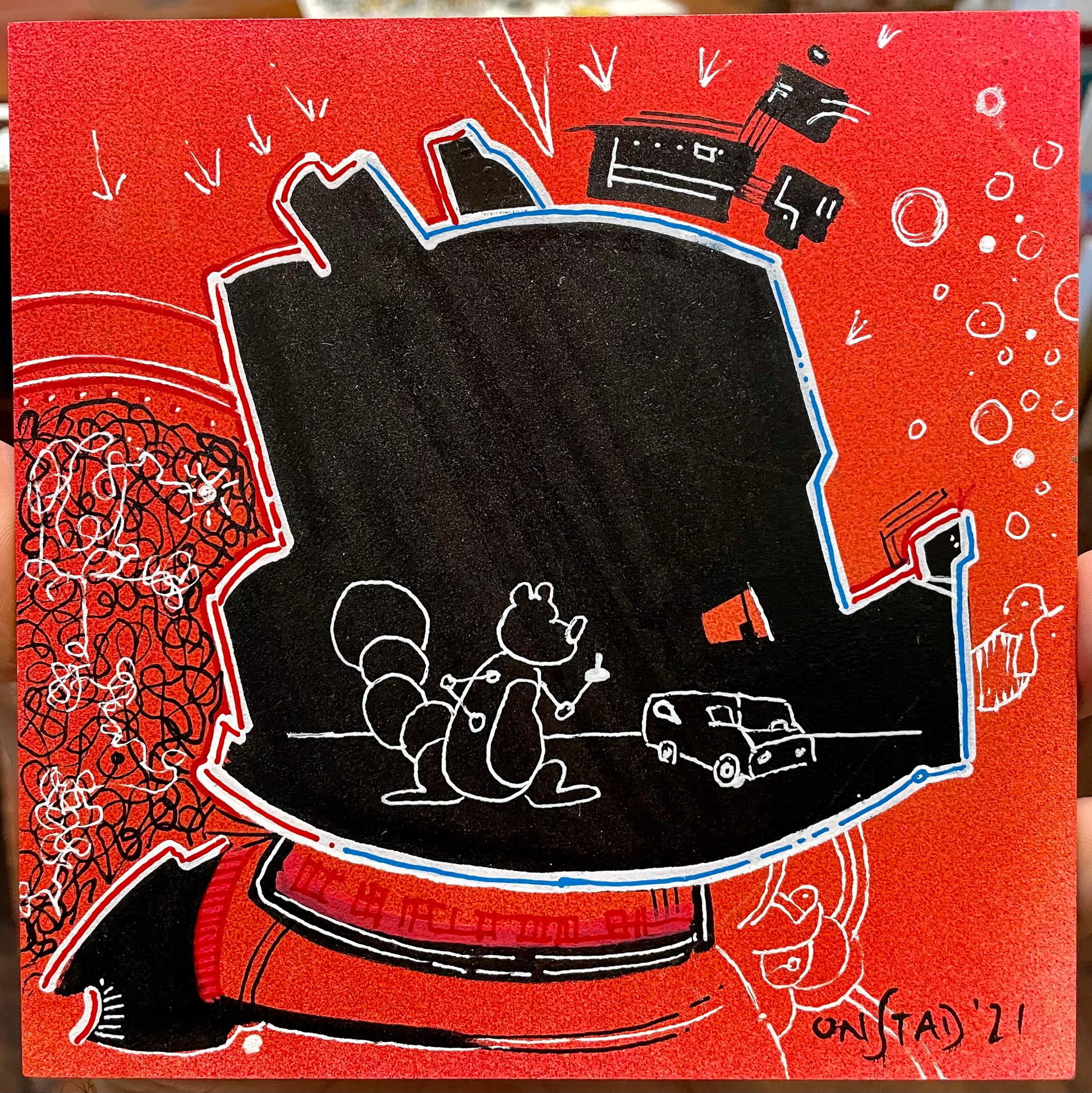 We asked Todd to become a visual abstraction of his own intellectual framework. When he finished cursing and sporadically urinating, we took the matter upon ourselves, and produced this. 6" square, oil pen on sealed bright white gesso board, 1/8" thick.